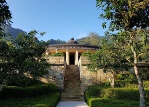 吹き抜けの向こうには、遺跡を望むストゥーパ(仏塔)をモチーフにしたエントランス・ロビー。その円形のテラスを中心に、ヴィラ群が弧を描くように広がっています。